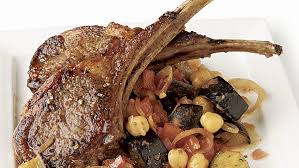 Thick slices of eggplant are topped with a salad of roasted red bell peppers, feta cheese, olives and garbanzo beans; then the salad is drizzled with a tangy balsamic dressing. It's nice with a Pinot Blanc or a Chardonnay. Pears poached in red wine and served with chocolate sauce and a glass of Sauternes make a lovely dessert.