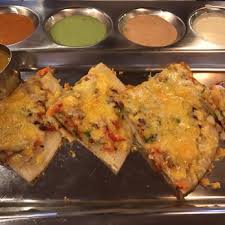 Rava Dosa Batter: * Rice flour. * Semolina flour. * Ginger. * Curry leaf. * Coriander. * Salt. * Fenugreek. Masala filling (lightly spiced): * Onion. * Potato. * Carrot. * Green peas. * Green coriander. Pizza Uttapam (contains rice flour, urud dal & water) it is the same batter as used for making normal Dosa's; but spread on the hot griddle a lot thicker, it's then topped with: * Chopped green capsicum. * Chopped tomato. * Chopped red onion. * Green chilli. * Freshly chopped green coriander. * Black pepper. * Gunpowder. * Vegetable oil. They are both served with three delicious chutneys': White Coconut Chutney: * Coconut. * Roasted chana. * Green chilli. * Ginger. Green Coriander Chutney: * Green coriander. * Roasted chana. * Green chilli. Red Tomato Chutney: * Onion. * Tomato. * Red chilli. Also served is a South Indian Sambar (spicy lentil soup): * Onion. * Tomato. * Tamarind. * Dal.